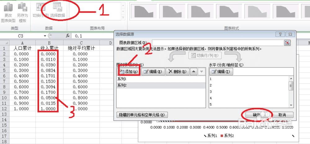 三、点击“选择数据”,如图1。弹出一个工作框,点击添加。出现如图2小框,输入如图2内容,然后添加“收入累计”数据,点击确定,之后如图1,再确定。