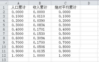 小编随便编的几个数据,不要较真。画洛伦兹曲线需要准备的数据分为三项: