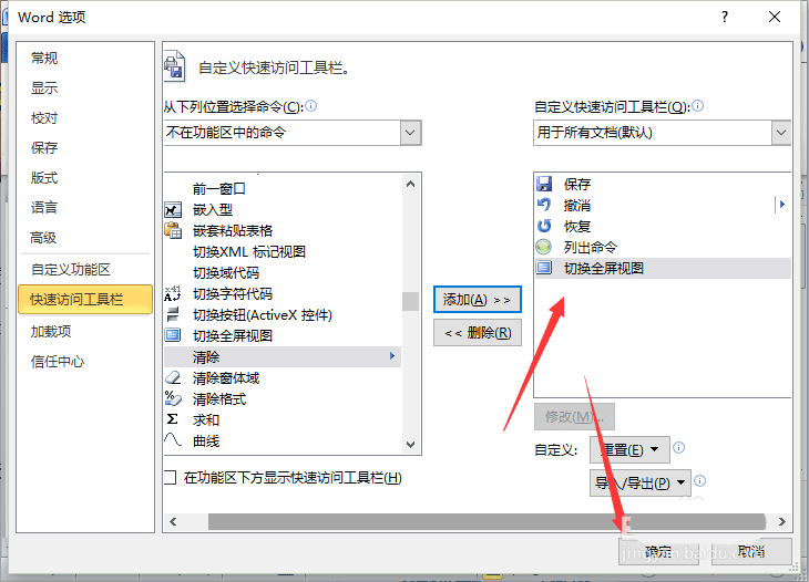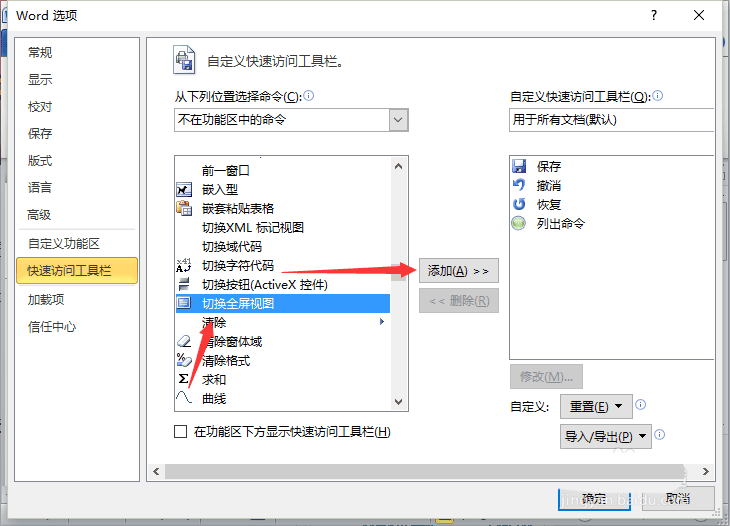 6、在“快速访问工具栏”选项卡的右侧窗格中,在“从下列位置选择命令”中选择“不在功能区的命令”,再将“切换全屏视图”添加到“自定义快速访问工具栏”。如图所示;