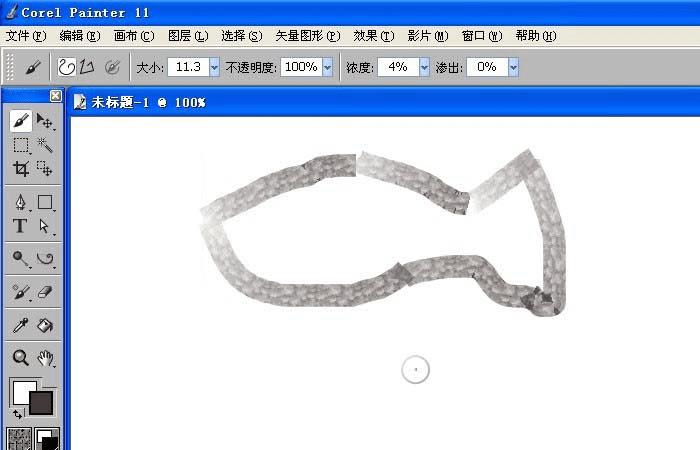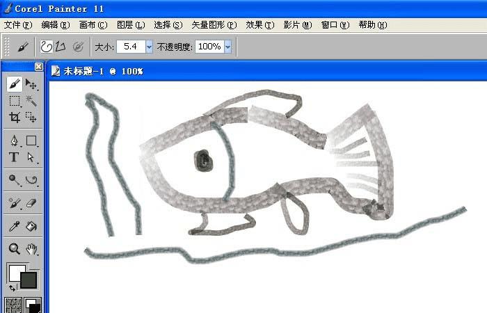 2、接着,设置画笔的颜色为棕色,画笔的大小为10,并用画笔在画布上绘画一条鱼的轮廓部分出来,如下图所示。
