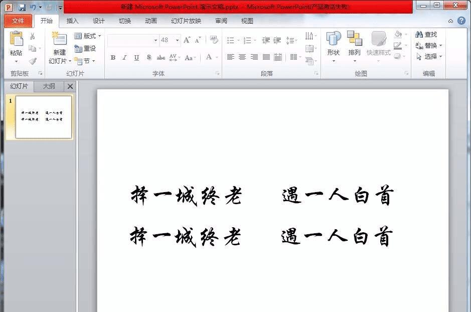 1、首先建一个空白演示文稿,然后新建一个幻灯片,我这里插入文本写了一句话。然后复制一个相同的文本出来。