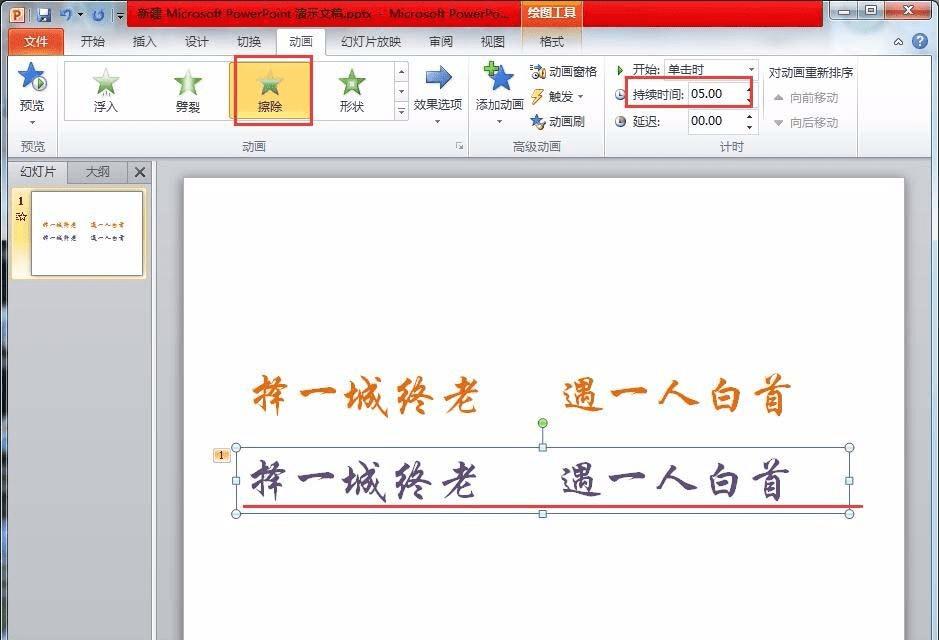 3、选择下面一个文本框,添加动画。这里选择“擦除”,设置效果从左至右,然后设置持续时间为5秒
