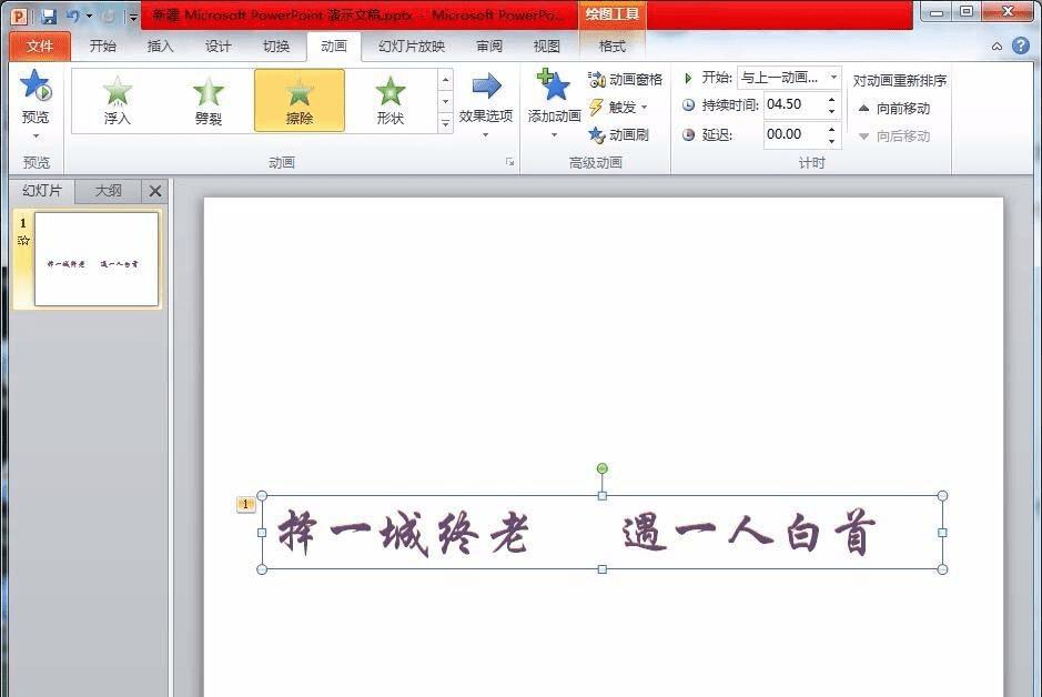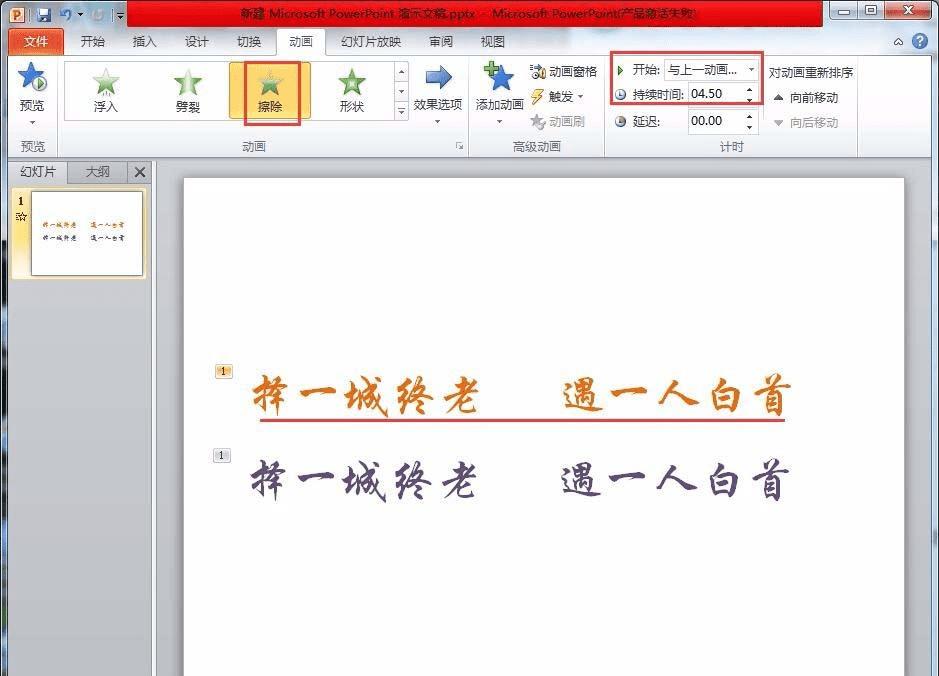4、设置上面一个文本框,添加动画,也选择擦除,设置效果从左至右,与上面相同。不同的是设置持续时间为4.5秒,如果效果不明显的话还可以调整,开始选择与上一动画同时。
