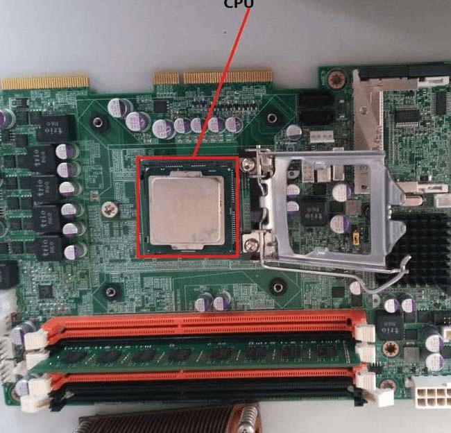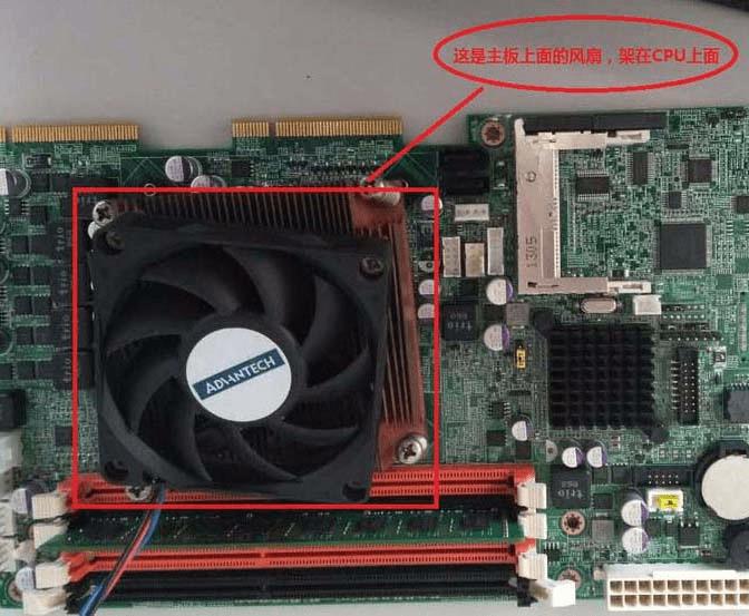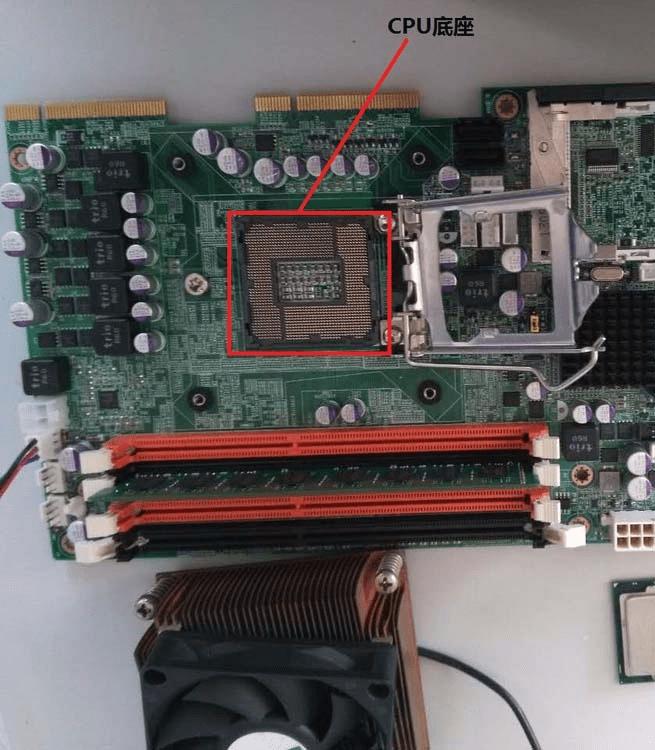 1、提供一个超级准确的方法,如果是整机就拆机,拆到露出如下主板,其中红色框框是存放CPU的地方,现在上面架了风扇。