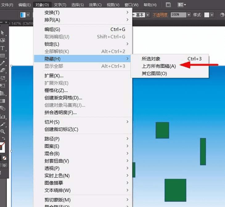 3、我们点击选择工具,选择蓝色背景图片,然后点击菜单栏里对象,隐藏,上方所有图稿,即可隐藏背景外的其他图片。