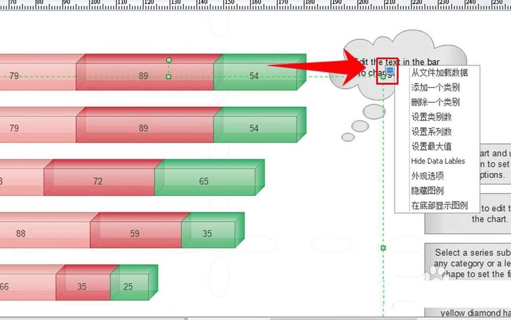 7、编辑类别。点击鼠标左键选中条形图,然后将鼠标移动至条形图右上方,这时处以隐藏状态的图标就会显现出来,点击该图标就会出现一个列表,点击列表中的内容就可以实现对类别的增加、删除等编辑工作。