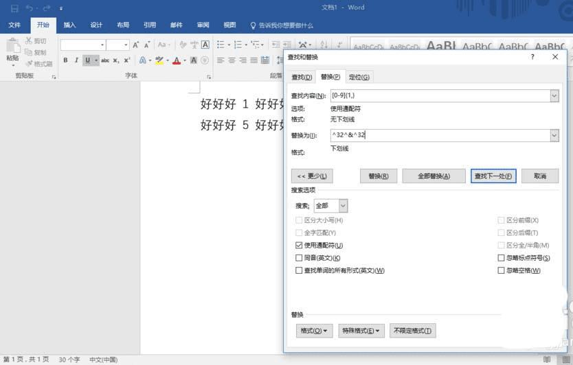 4、查找内容输入"[0-9]{1,}"、替换为输入"^32^&^32",勾选"使用通配符"。