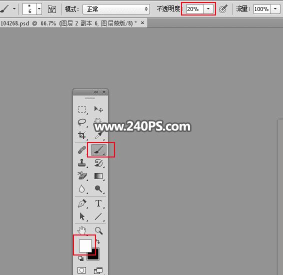 11、把前景色设置为白色,选择画笔工具,画笔不透明度设置为20%,如下图。