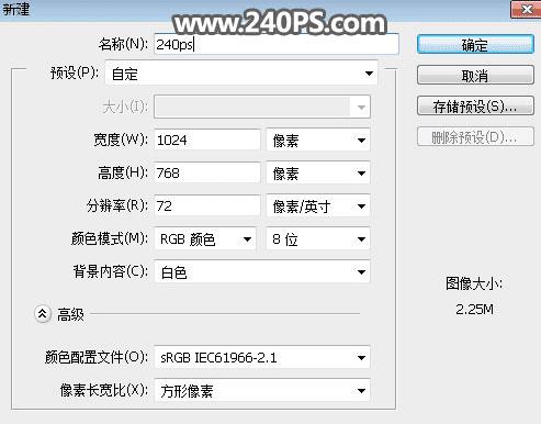 1、新建画布。打开PS软件,按Ctrl + N 新建,尺寸为1024 * 768像素,分辨率为72像素/英寸,如下图,然后确定。