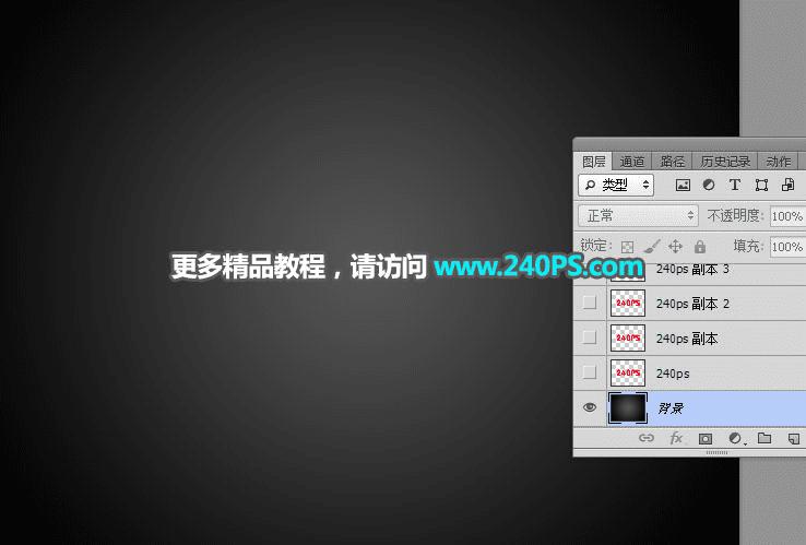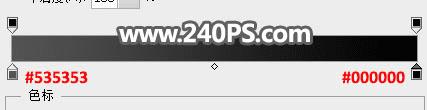 2、设置渐变色。在工具箱选择渐变工具,然后点击渐变设置渐变色,颜色设置为暗灰色至黑色,如下图;然后在属性栏选择“径向渐变”,不透明度设置为100%,如下图。