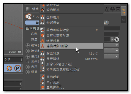 3、接着,鼠标在对象面板这里,右击,弹出一大串菜单中点:连接对象+删除