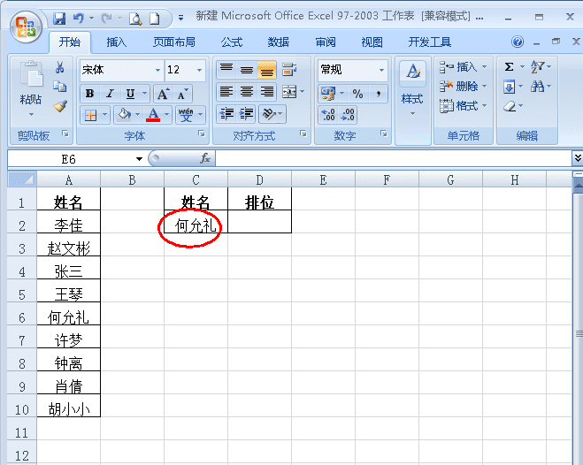 2、下面需要查找C2单元格中的名字在列表中的排位(如图);