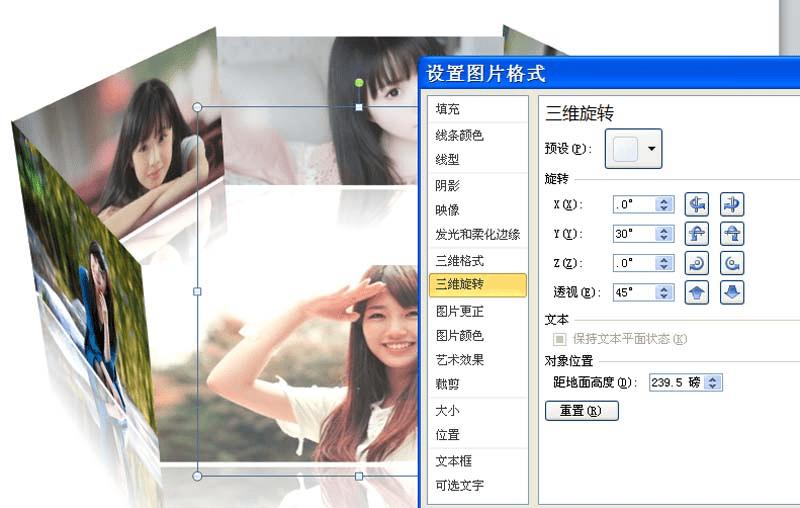 7、再次调出设置图片格式对话框,切换到三维旋转选项卡,设置y为30度,查看效果。