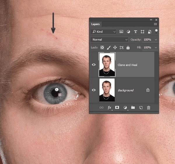 1、打开年轻人肖像图,然后对原素材图层进行复制(选择“图层>新图层>复制”)。选择污点修复笔刷,将下图所示的小伤口修复。