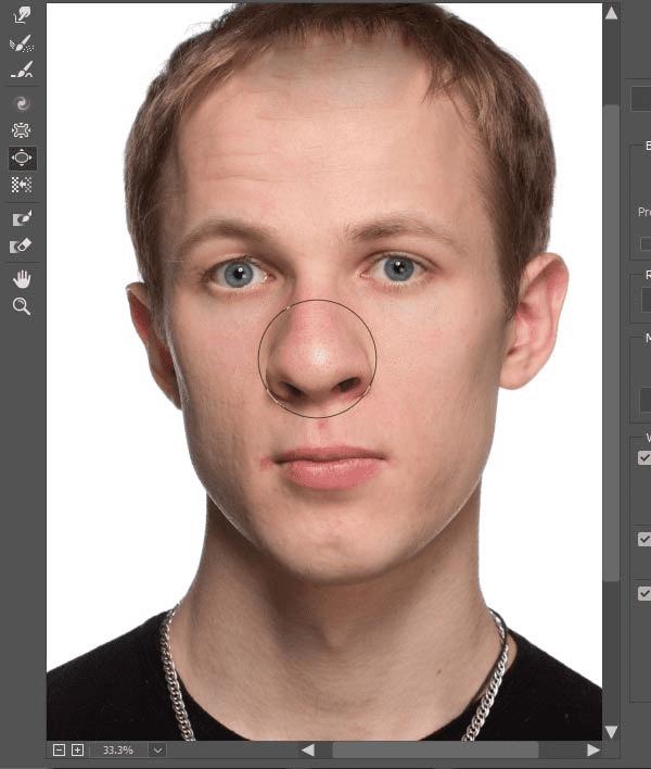 2、选择膨胀工具,设置画笔直径不要大于鼻子尖端。对着鼻子尖点几下,让鼻头显得大一点。