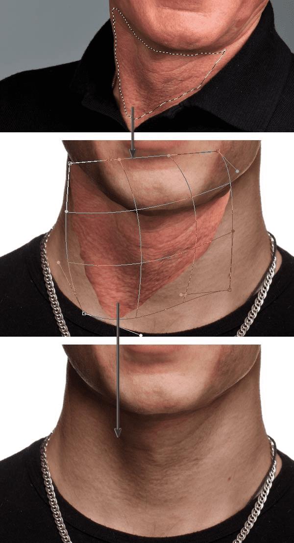 13、接下来就是脖子。同样复制老年的纹理,粘贴到年轻照片上,然后变形。