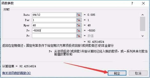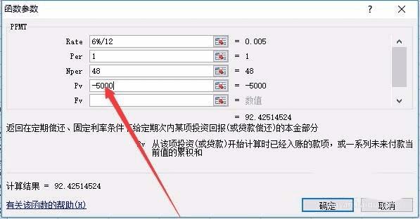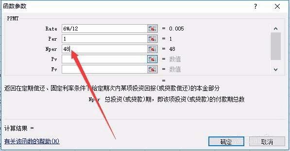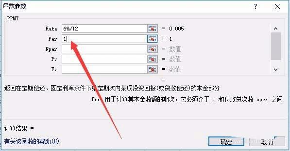 4、第二个参数表示特定的一期。该周期必须小于等于nper,这里1表示第一个月的还本金偿还额