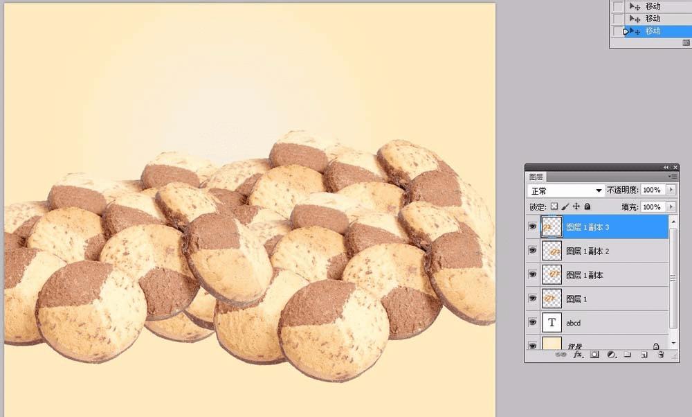 3、新建一个图层组,将饼干素材拖到这个图层组内,并复制几层,确保把文字全部覆盖祝