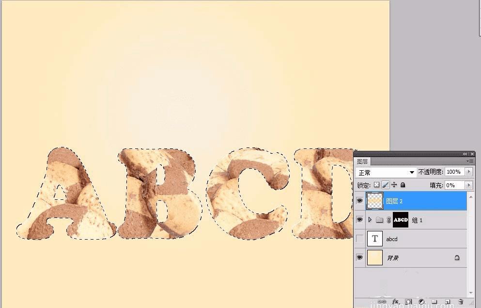 7、载入文字选区,再饼干图层组上面新建一层,填充颜色(颜色自定),填充设置为0%