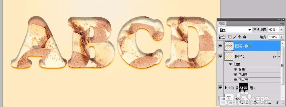 9、选择这个图层和饼干图层组,复制。然后取消复制图层中图层样式的投影效果,保留其它效果。合并复制的图层和饼干图层组更改混合模式为“叠加”,不透明度改为40%。