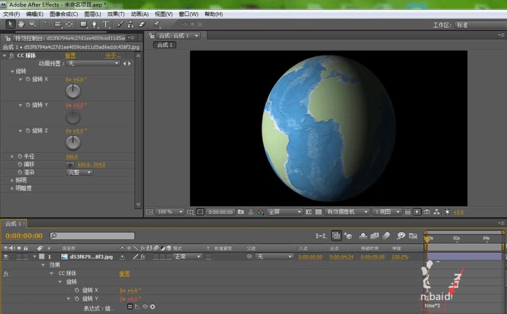 8、在图中的位置双击以后输入表达式time*3,再预览一下你会发现已经转动起来了,3还可以改成其他数字,你想让它转几圈就写什么数字。