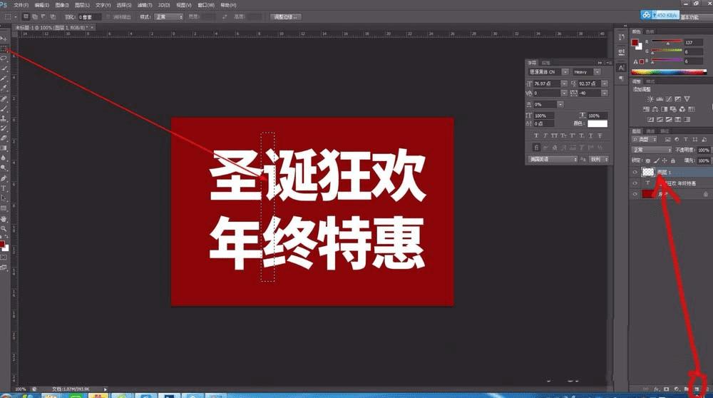 3、输入文字“圣诞狂欢 年终特惠“,选择一个粗体的,样例展示为思源黑体 heavy,调整字体的大小及行间距,字间距,告诉你一个小技巧,将文字全选,然后按alt键+方向键,可以调整文字字间距行间距,可以试一下,调整的字间距比较紧凑一点。