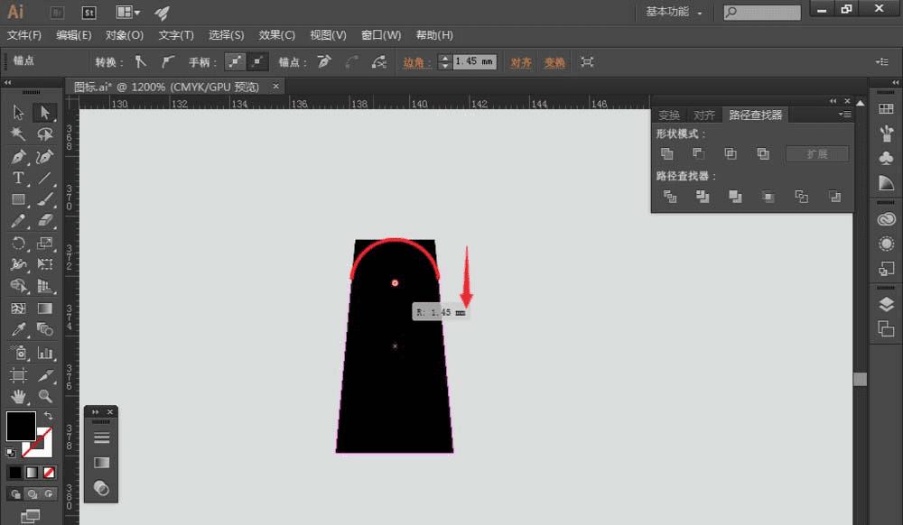 7、然后同时选中上面的两个锚点,使上面的角有1.45mm角半径的圆润,以此作为设置图标齿轮的波纹,如图: