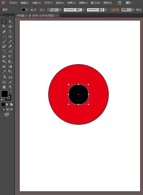 选择工具栏中的椭圆工具,按住shift键画一个正圆。画好后,填充红色,描边选择黑色,描边的大小为2像素,效果如下图: