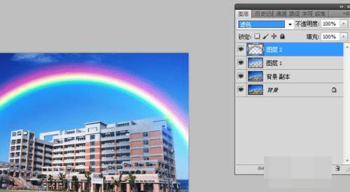 将图层2拖动图层1的下方,使彩虹放置到图像中点建筑物下方。