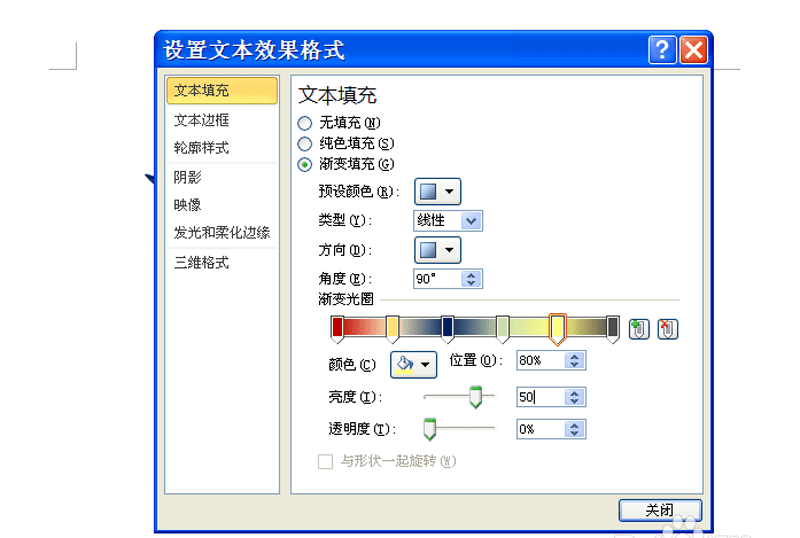 3、设置文本填充为渐变填充,类型为线性,角度为90度,选择第一个光圈设置为深红。