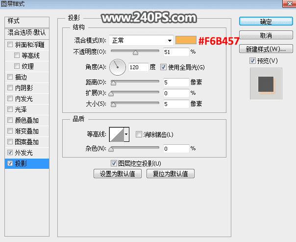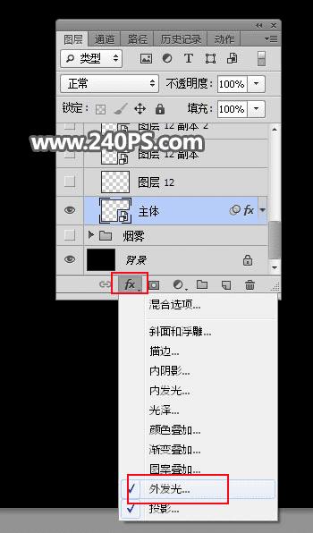 8、按下图的方法给当前图层添加图层样式,设置外发光和投影,参数及效果如下图。
