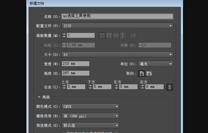 1、打开ai软件后,先按ctrl+n新建一个文档,命名为"ai选择工具使用",如图所示;