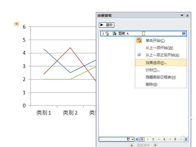 3、调出动画窗格,点击动画右下角的下拉选项,选择效果选项。