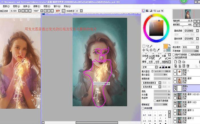 35、用发光图层把手中发光的灯泡和被灯光影响的边缘涂了一层。