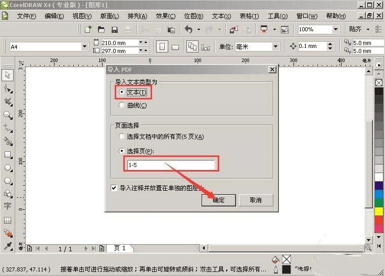 3、现在打开CorelDRAW软件,我用的X4,把输出的PDF格式文件,直接拖到CDR里,出现选择框时,选择文本(文字可编辑),如果你导入的页数比较多,最好是分页导入