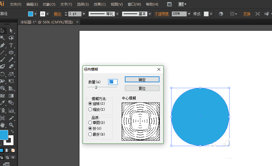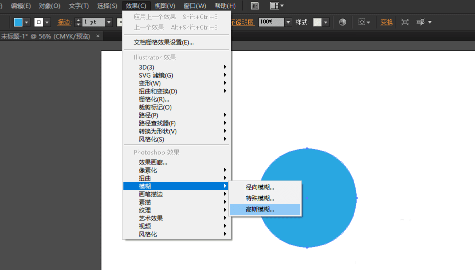 2、请选择该圆,执行以下步骤:效果-模糊-高斯模糊。这样将会弹出高斯模糊的编辑对话框。