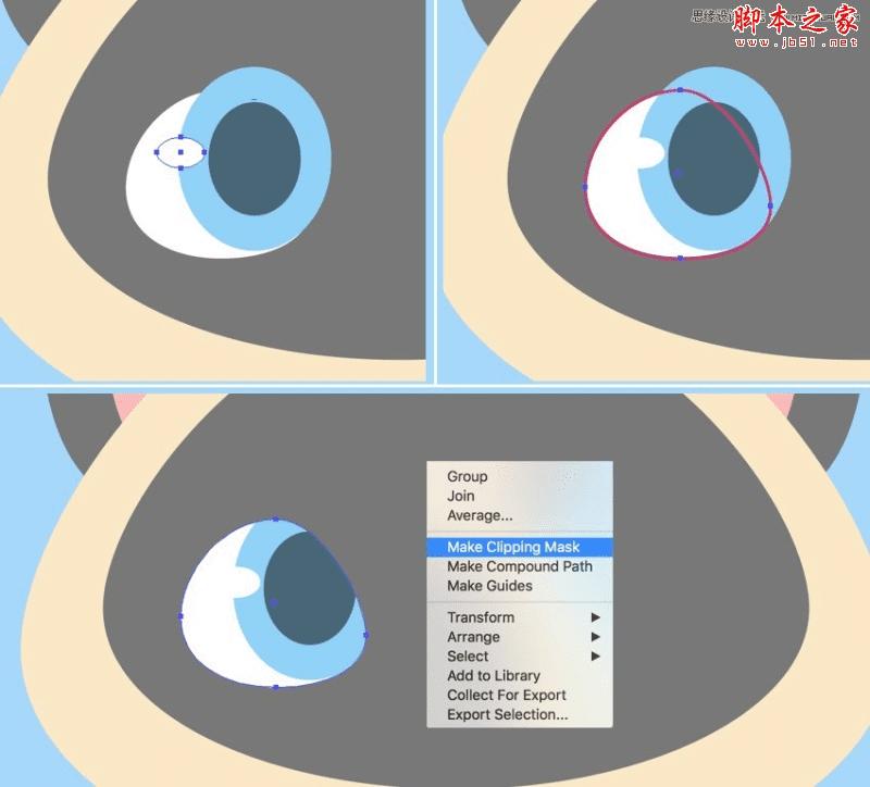 复制(Control-C)白眼球,粘贴在前面(Control-F)并置前(Shift-Control-])。 现在选择眼睛的所有元素,单击鼠标右键,然后选择建立剪切蒙版,从而将所有内容放置在顶部副本中,作为虚构容器。 此容器内的所有形状仍然可编辑。您可以在图层面板中找到剪辑组,展开它,然后移动,编辑和重新排列对象。