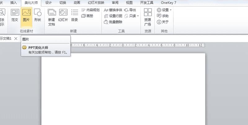 1、首先启动ppt2010,新建一文档,执行美化大师菜单,从中选择图片选项。