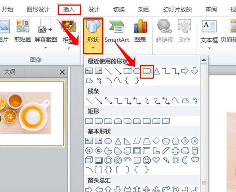 3、点击PPT菜单栏中的【插入】,然后工具栏中选择【形状】,接着在其列表中选择【圆角矩形】。