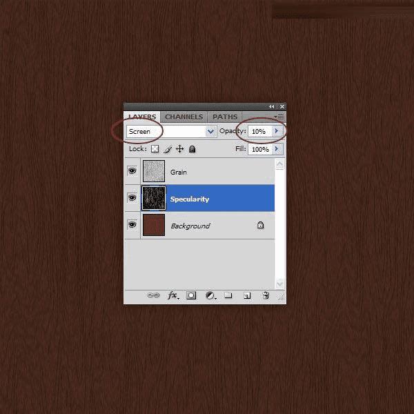 15. 改变‘Specularity’的图层混合模式为滤色,不透明度调整为10%,然后再打开“Grain”图层。