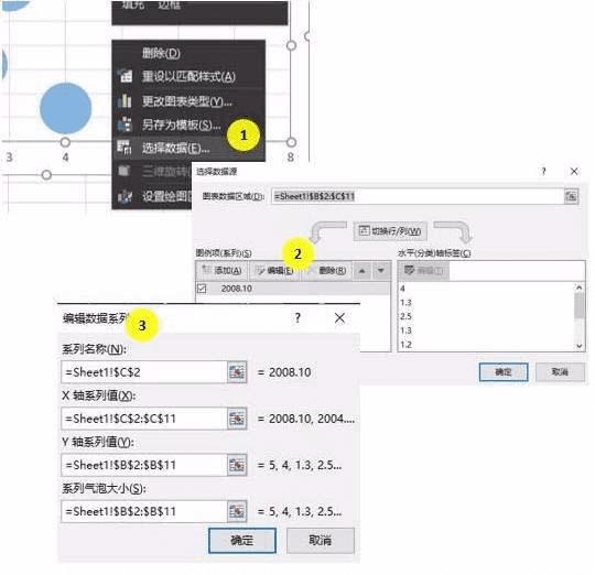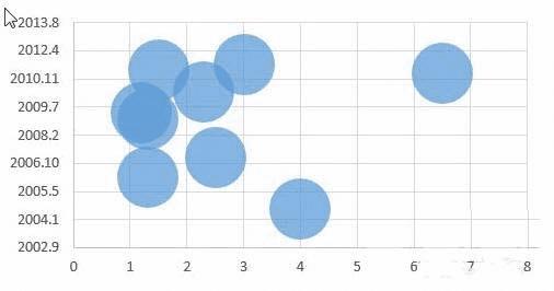 3、图表设置:自动生成的图表,把横轴和纵轴的位置是相反的,同时代表气泡面积的数据也默认为同一个数值。在X轴系列值选择上线时间列数据,Y轴系列值选择用户量列数据,系列气泡大小同样选择用户量列数据。
