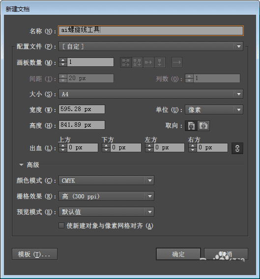 1、首先打开ai软件,按ctrl+n键创建一个空的ai文件,取名叫"AI螺旋线工具",如图所示;