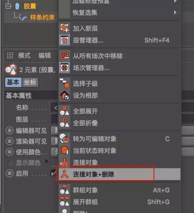 第四步:全选胶囊和样条约束,右键连接对象+删除,操作后会生成一个叫胶囊的多边形对象