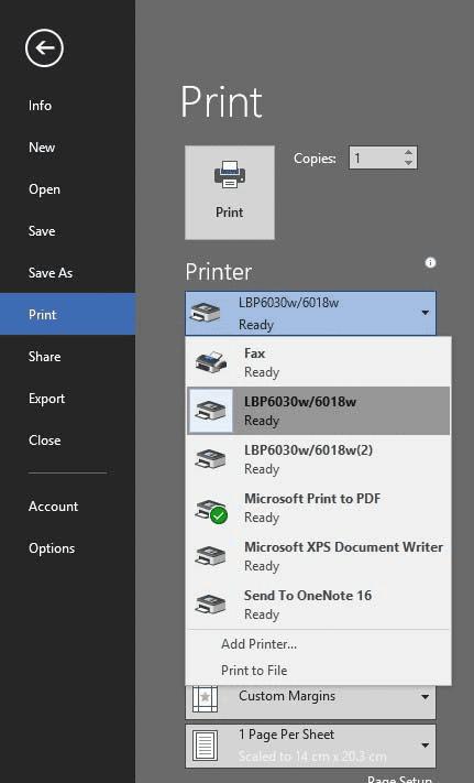 13、打开一个word文件,选择打印,在打印机选项里选择LBP6038w/6018w,发现打印机已经就绪,这就可以无线打印了。