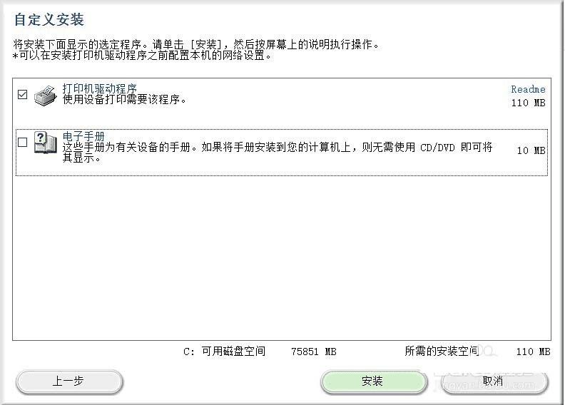 3、选择打印机驱动程序,电子手册可以不用装,也没什么用。点击安装。