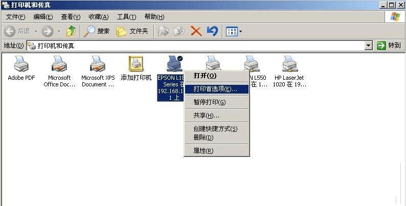 2、选中要清选的打印机,鼠标右键“打印首选项”
