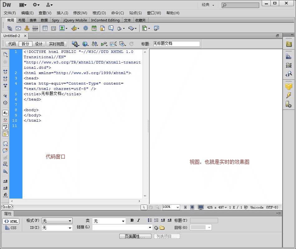 3、在新建的html文件上,我点开的是“拆分”模式,所以左侧显示的是代码,右边是效果,这样可以在左边写代码,右边预览。