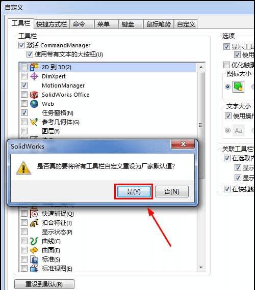 在solidworks工具条乱了时恢复默认设置的步骤