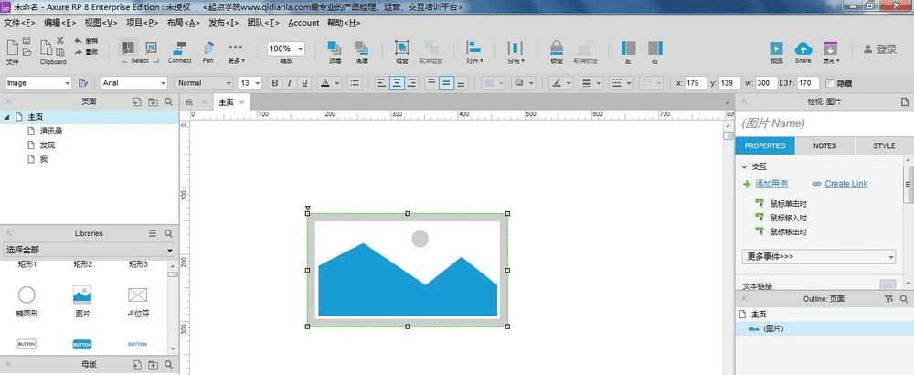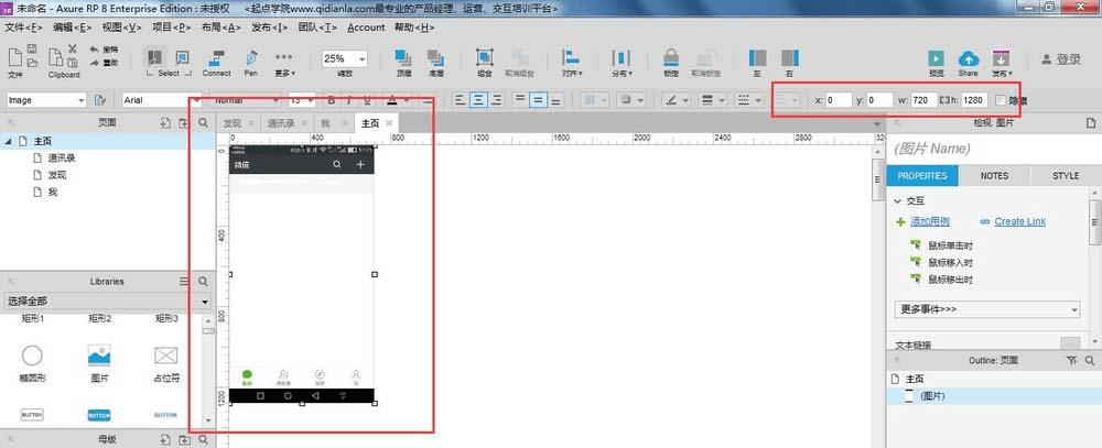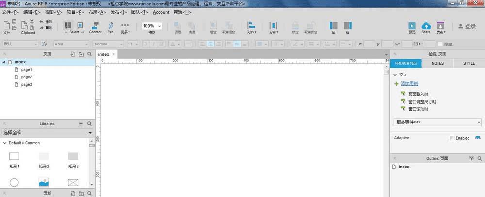 2、axure界面是这样的,最上面是菜单栏,靠下位置为属性栏,中间是操作区域,右侧有交互效果