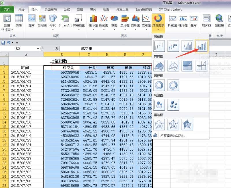 1、为了更方便地说明Excel股价图模板的使用方法,这里小试牛刀。首先利用证券软件下载股市数据,数据格式选择Excel的形式。选择数据区域,插入“成交量—开盘—最高—最低—收盘”股价图,注意,数值系列的顺序不能乱,一定要按照成交量、开盘、最高、最低、收盘来排列。